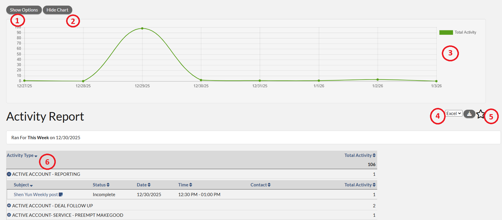 - Report Data - the table at the bottom of the screen is the data from the report. The Activity Report is formatted so that the hierarchy is on the far left and that the activity is the final item in your hierarchy, followed by columns for:
