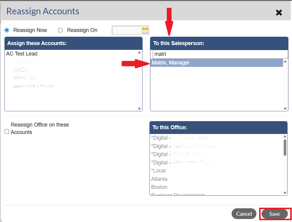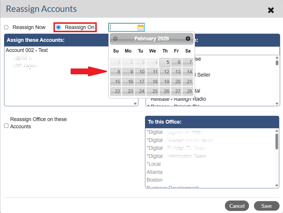 Note: If you want to reassign the Accounts on a specific date, choose to Reassign on, add the date that you would like the reassignment to take place before choosing the Salesperson name and clicking Save.