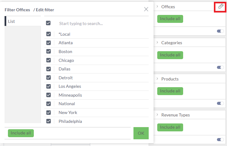 - Editing Filters – Hover on the filter until the pencil icon appears in the top right corner. Click on the pencil icon. Then Edit filter window will display so you can select from and edit any of the filter types.