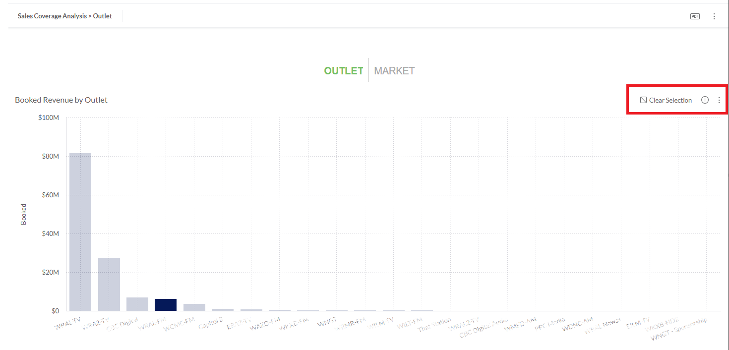 You can toggle the view between Outlet or Market to shift the sales coverages area type. The bar chart provides you a high-level view of where sales or revenue has been booked in outlets or markets.