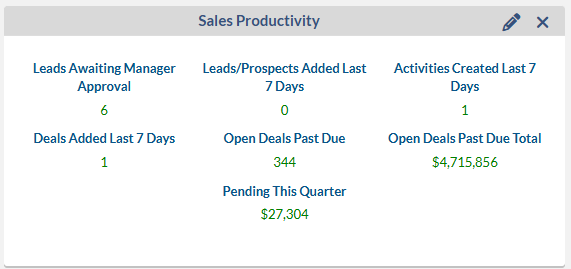 This Data Card displays forecast and booked dollars. With the Expanded View, it will load the Sales Outlook pod, an interactive reporting dashboard. To learn more about Sales Outlook Data Card, please click here