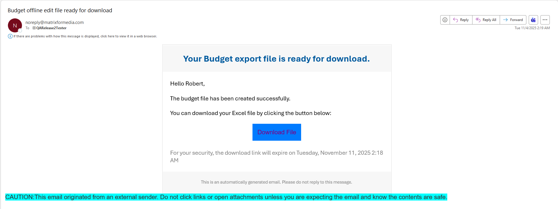 - When the Budget Export for Offline Edit file is large, you will receive a green message of "The report is being generated. You'll receive an email notification when it's ready for download" on the top right of the page. Matrix will send you an email for the link to download a file. The email will come from "noreply@matrixformedia.com" with the subject of "Budget Offline edit file ready for download". The download link in the email will be expired 7 days after generation.