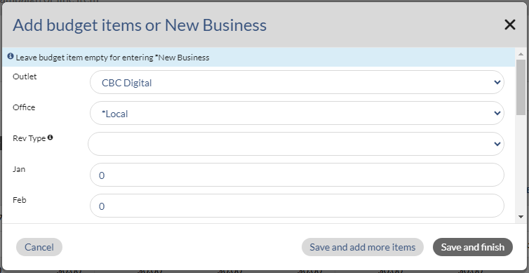 1. Click on the (+) Add Budget Item or New Business button which is located at the bottom left corner of the page.