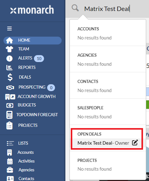 1. Navigate to a Deal Profile by typing in the Deal name on the global search and then click the Deal name under OPEN DEALS section. The Deal profile will display.