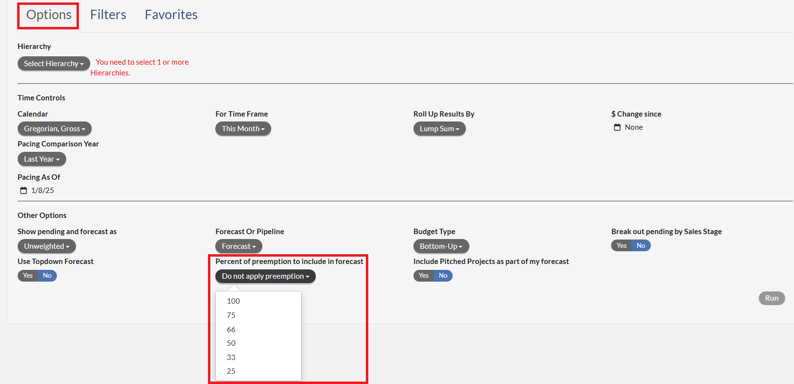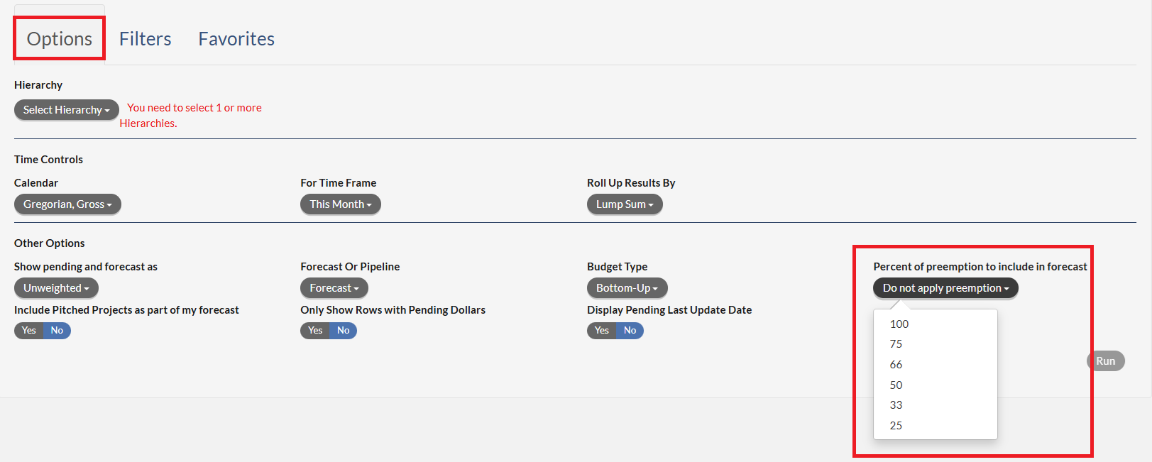 4. On the Options tab, click the Percent of preemption to include in forecast and select the percentage number. Please also set up Hierarchy before clicking Run button to pull out the report.