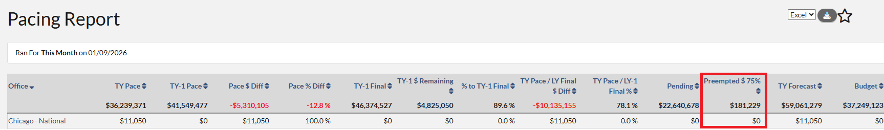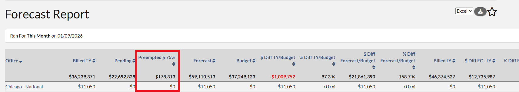 Notice a PREEMPTED$ column is added when preemptions has been selected. Your Forecast will now be totaled as (TY + Pending + Preempted = Forecast).