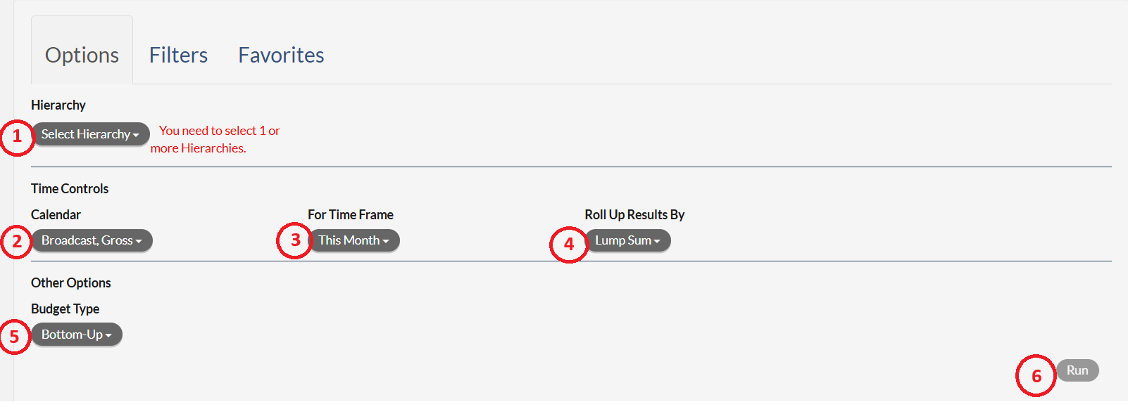 - Run Button - once all options have been selected, clicking the Run button will run the report.
