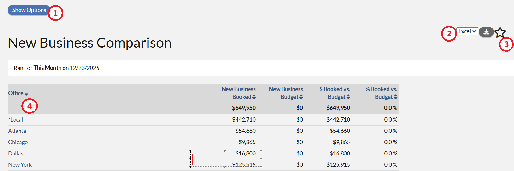 - Report Data - the table at the bottom of the screen is the data from the report. The New Business Comparison Report is formatted so that the hierarchy is on the far left, followed by a column for the New Business Booked, New Business Budget, $Booked vs. Budget and %Booked vs. Budget.
