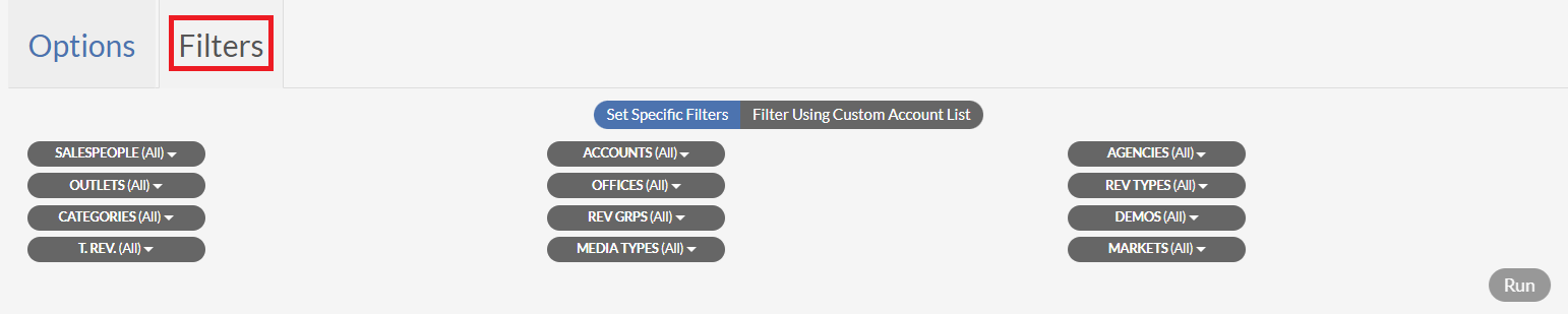 Clicking the Filters tab will allow you to select or not select various data points or groups within the report.