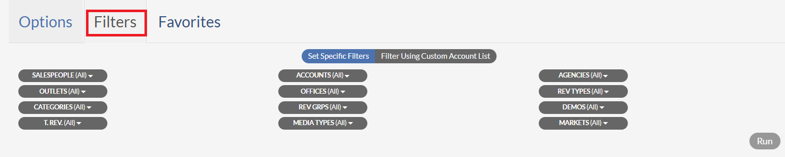Clicking the Filters tab will allow you to select or not select various data points or groups within the report.