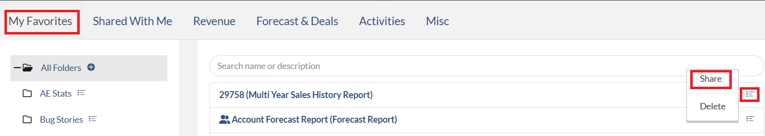 2. From the My Favorites tab of the Reports page, click on the Options icon on the far right and select Share.