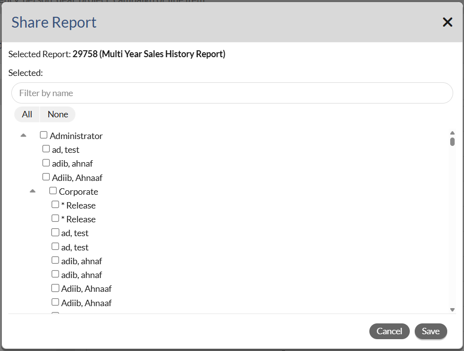 3. A new Share Report screen will display. Use this screen to select the individuals or teams that you would like to share the report with.