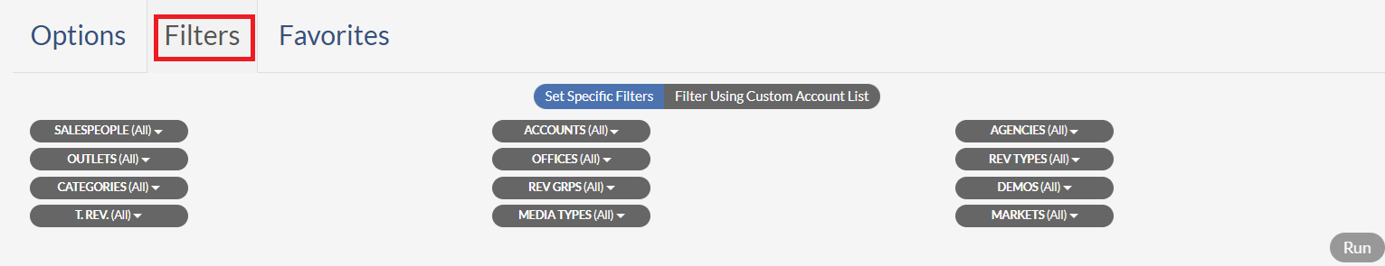 - Run Button - once all options have been selected, clicking the Run button will run the report.