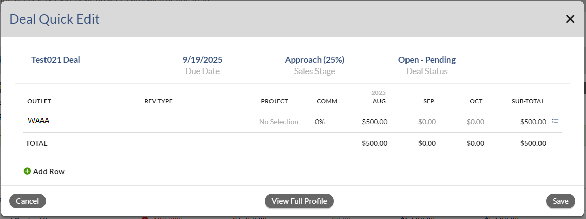 - Click on the pencil icon next to the pending amount to launch the Deal Quick Edit window. Note that if you click on the Deal name, this will take you to the Deal profile.