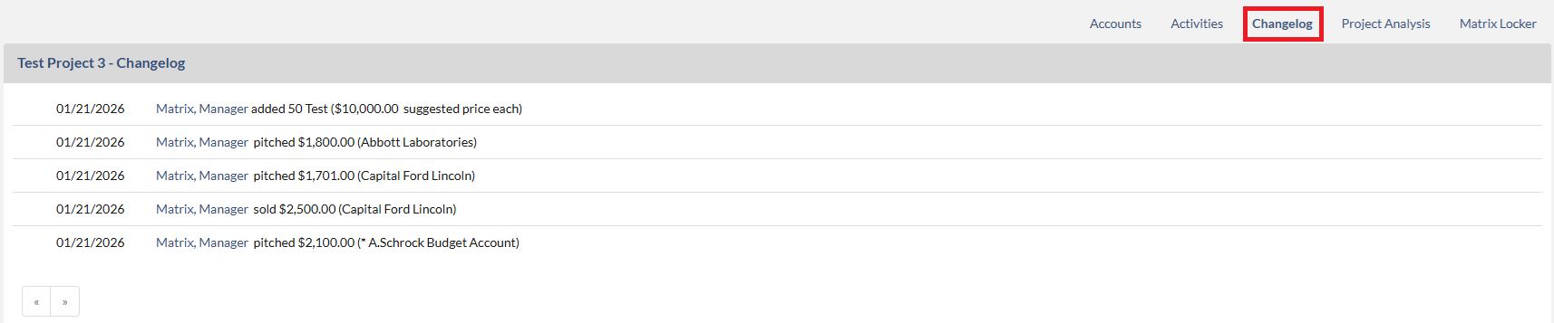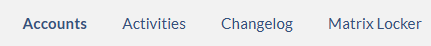 On the Project profile page under the data cards, there are 4 tabs: Accounts, Activities, Changelog, and Matrix Locker.