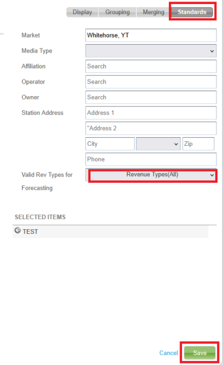 6. Click Standards tab and Valid Rev Types for Forecasting drop down. Then select only the Rev Types that you wish to set up for an outlet and click Save.