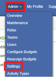 1. Log into Admin site, click Admin and select Settings.