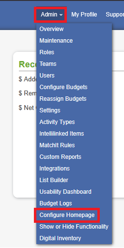To get started, as an Admin, click on the Configure Homepage link from the Settings navigation menu.