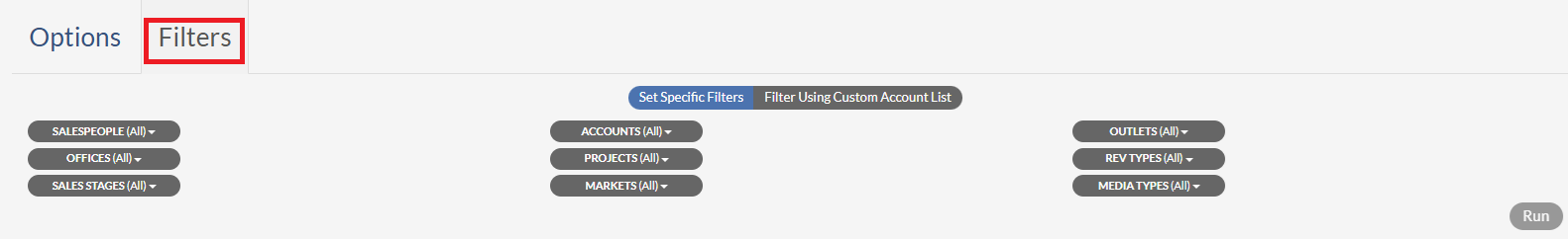3. Run Button - once all options have been selected, clicking the Run button will run the report.