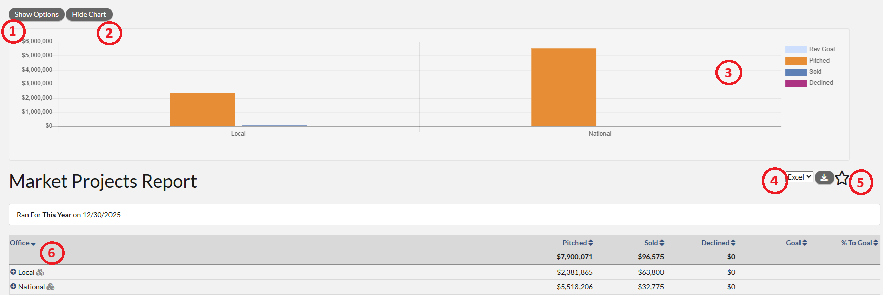The Market Projects Report will show the the Pitched, Won, Lost, and Goal information for a project and how entities like Salespeople, Accounts, Offices, Outlets, and Revenue Types roll up into those metrics.