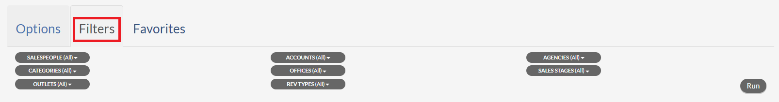 1. Hierarchy Selection - Choose from Accounts, Agencies, Categories, Offices, Sales Stages, and Salespeople.