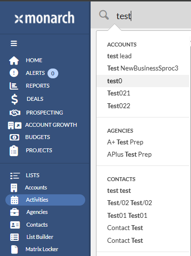Note you can access the Account or Contact profile by typing in the Account or Contact name on the Global and click the name from the pop-up list. The profile will display.