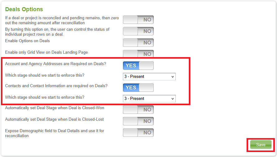 - Once these options are set to YES, then the admin must pick which Sales Stage to start enforcing Addresses and/or Contacts on the deals.