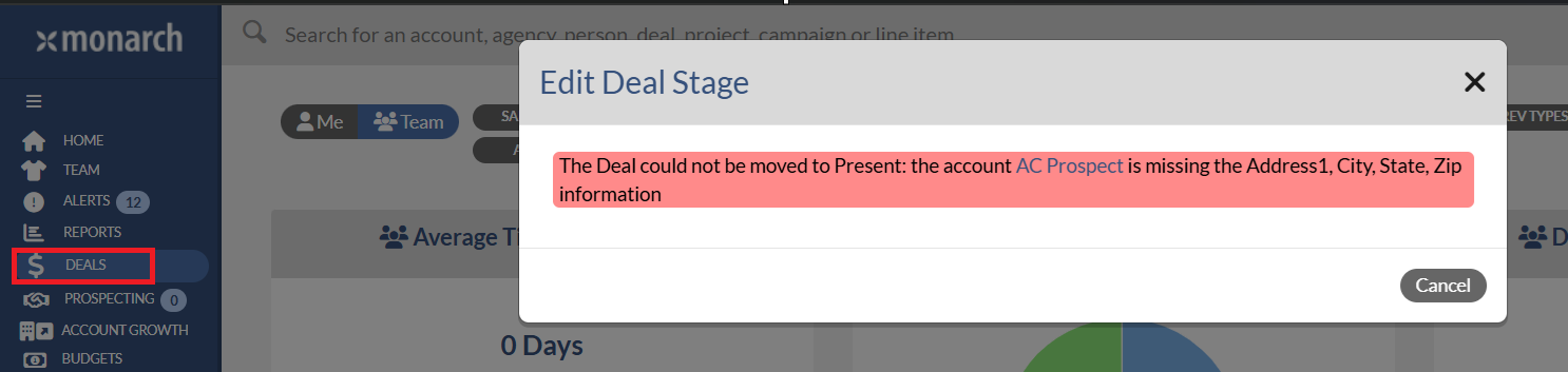 Similar to the deal creation workflow, when a Sales Stage 2 or later is enforced for Accounts and Agencies Monarch will check that proper address information exists for the Account and/or Agency on the deal. If the deal does not have the required information, you will receive error messages when trying to enter that Sales Stage. This can happen from locations like the Deal Profile, Quick Deal, and on the Grid View on the Deals Landing Page.
