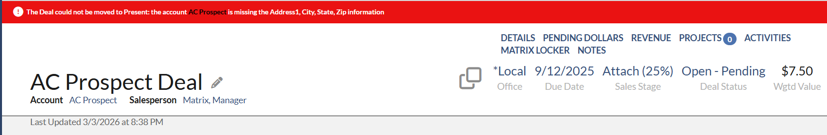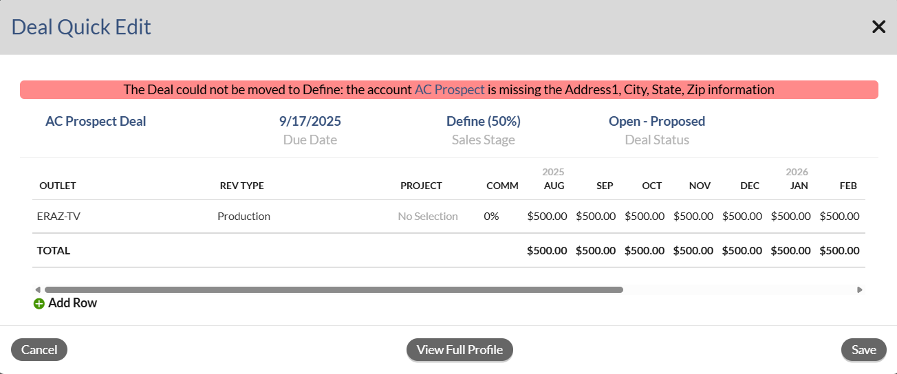 On the Deal Quick Add dialog, after you fill out all the necessary information and click the Save button, an error message displays at the top if the Account or Agency is missing address or contact information. For example, if you are only missing the City, the message will specify that the City is missing, making it easier to know exactly what is expected of you to create this deal. To correct the error, you can simply click the Account or Agency name on the error message, then click the pencil icon on the Account or Agency profile and fill out the missing information.