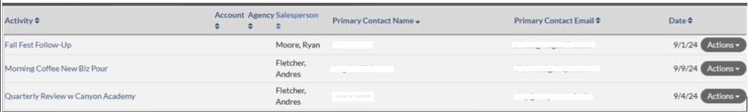 3. Clicking on the notification, once Activities from Clarity events are created, will load the expanded view of the notification where you can review the Activities created as well as the Account (If known), Agency (if known), Salesperson, Sender Name, Sender Email, and Date the Activity was created. Any Activities that are created by Clarity, whether originating from an Email or Calendar Event, will display on this notification.