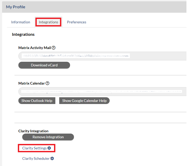 2. Click Integrations tab and then Clarity Settings link(visible after you have initially authenticated to use the Clarity Integration).