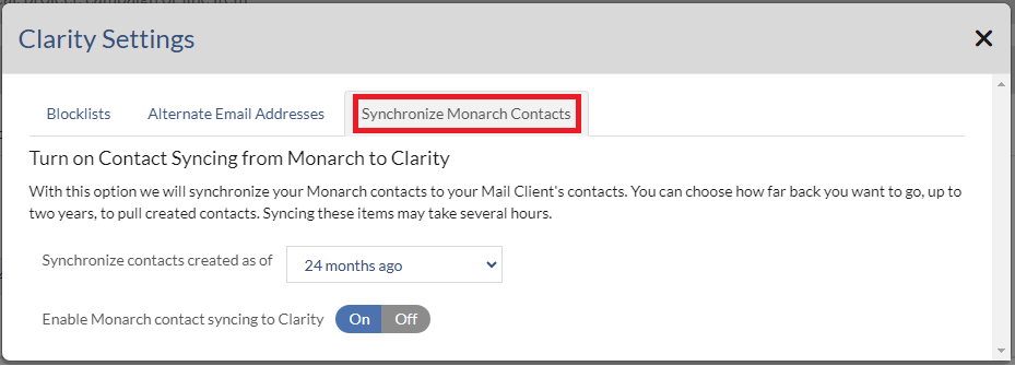 6. Then set Enable Monarch contact syncing to Clarity to ON. You will be prompted for a confirmation which you should say YES to. Once confirmed you can close the dialog. If you ever wish to stop synching contacts in the future, simply change that synch option to NO and close the dialog. Future contacts created in Monarch will no longer sync to Outlook.