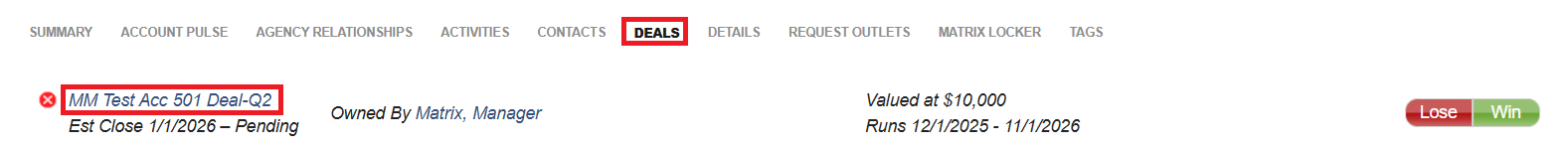 - The shared salesperson can access or edit any Deals on the shared account. To access a deal on the shared account, click the Deals tab and then click the Deal name to access the Deal profile.