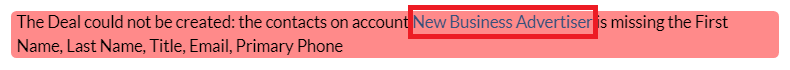 You may receive the message of missing contact information while you try to add a new Deal or update a Deal. This means that Contact on Account or Agency profile is missing the below information or there is no Contact on on Account or Agency profile.