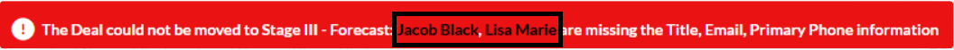 This means you have some Contacts on the Deal profile but some of their information are missing. You will need to fill out the missing information on one of the contacts to pass the validation. To fill out the missing information,